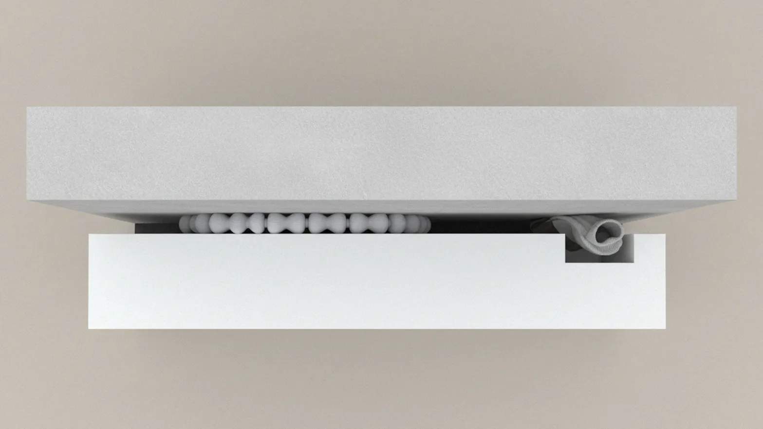 An AirPod falls under a dresser. Instead of lifting furniture, the robot deploys a 2–3 cm soft pneumatic tentacle that slides underneath, gently pulls the object toward a tray, and retracts.
